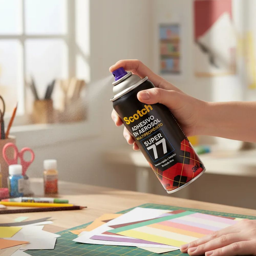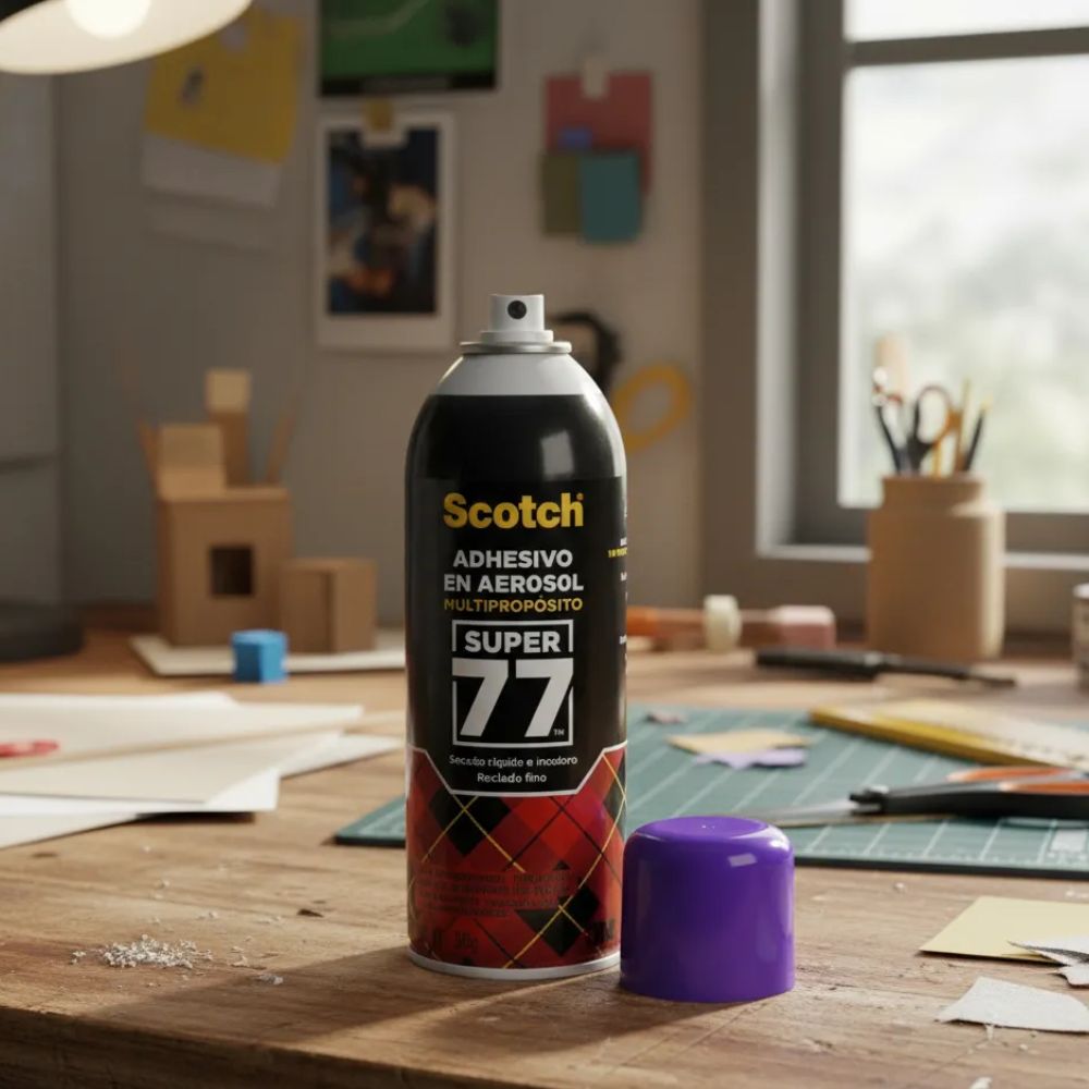 El Adhesivo SCOTCH® Super 77 es el estándar de oro en adhesivos multipropósito. Su fórmula profesional ofrece un tack agresivo y un secado ultra rápido, permitiendo uniones permanentes sobre casi cualquier material. Diseñado para una aplicación **limpia y uniforme**, es la solución versátil y confiable que necesitas para proyectos de alto nivel y reparaciones urgentes.