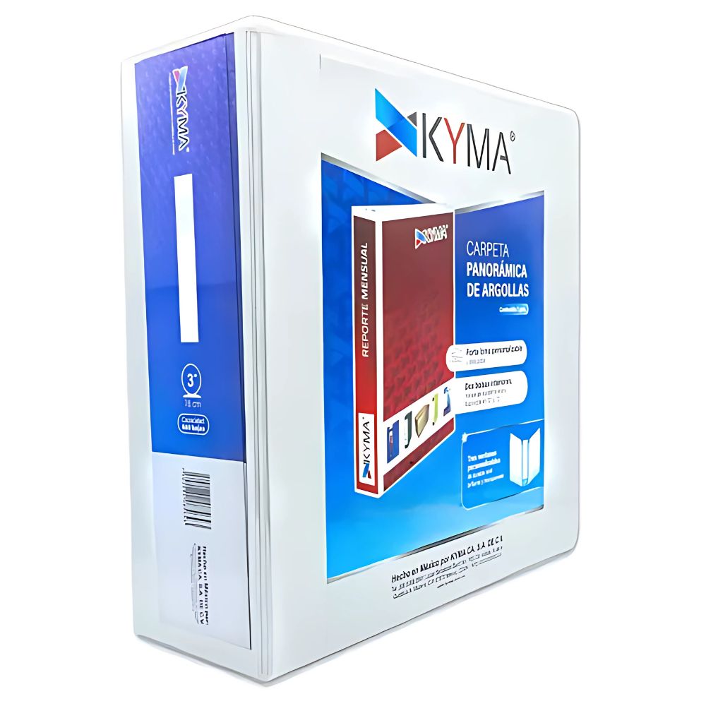 Organiza, guarda y presenta tus documentos importantes con la **Carpeta Panorámica Kyma Oficio Blanca**. Elaborada con **cartón, vinil y herrajes de la más alta calidad**, esta carpeta es la solución ideal para mantener tus archivos seguros y presentables en la oficina, escuela o el hogar.